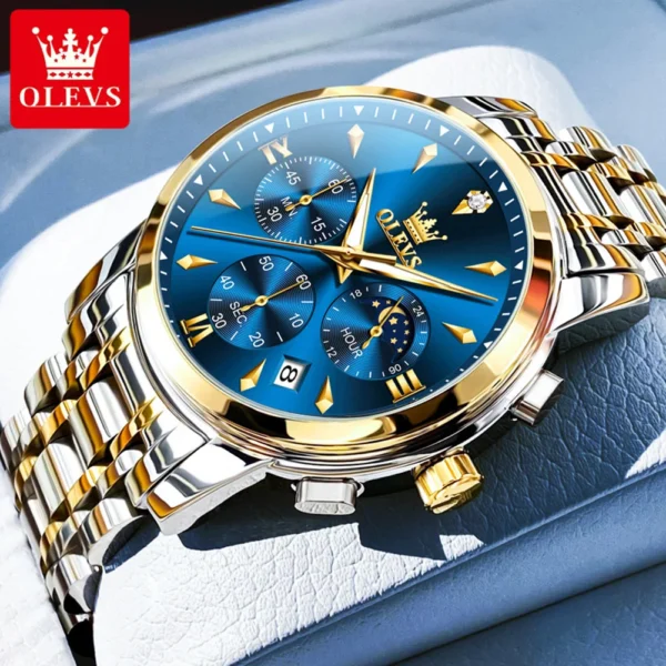 OLEVS 3653 Moon Phase Chronograph Stainless Steel Men’s Watch-Gold Blue