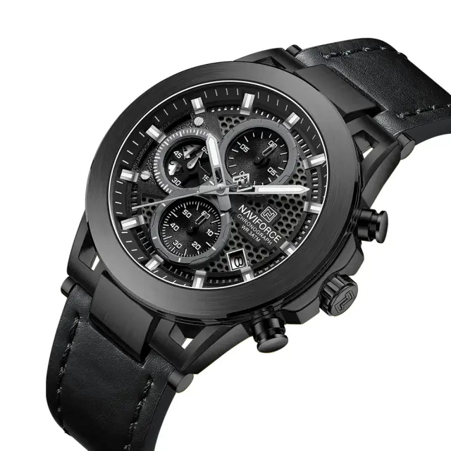 Naviforce 9099 Leather Wrist Watch For Men-Black White