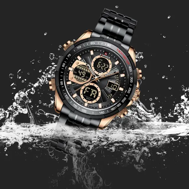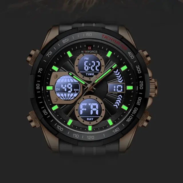 ◉ Features: Stainless steel back cover, two-color 45 mm zinc alloy shell, hardened mineral glass crystal luminous hands, LED backlit dial, chronograph dual-time alarm clock SIG snooze function, and display specific hours, minutes, seconds, days, months and weeks;