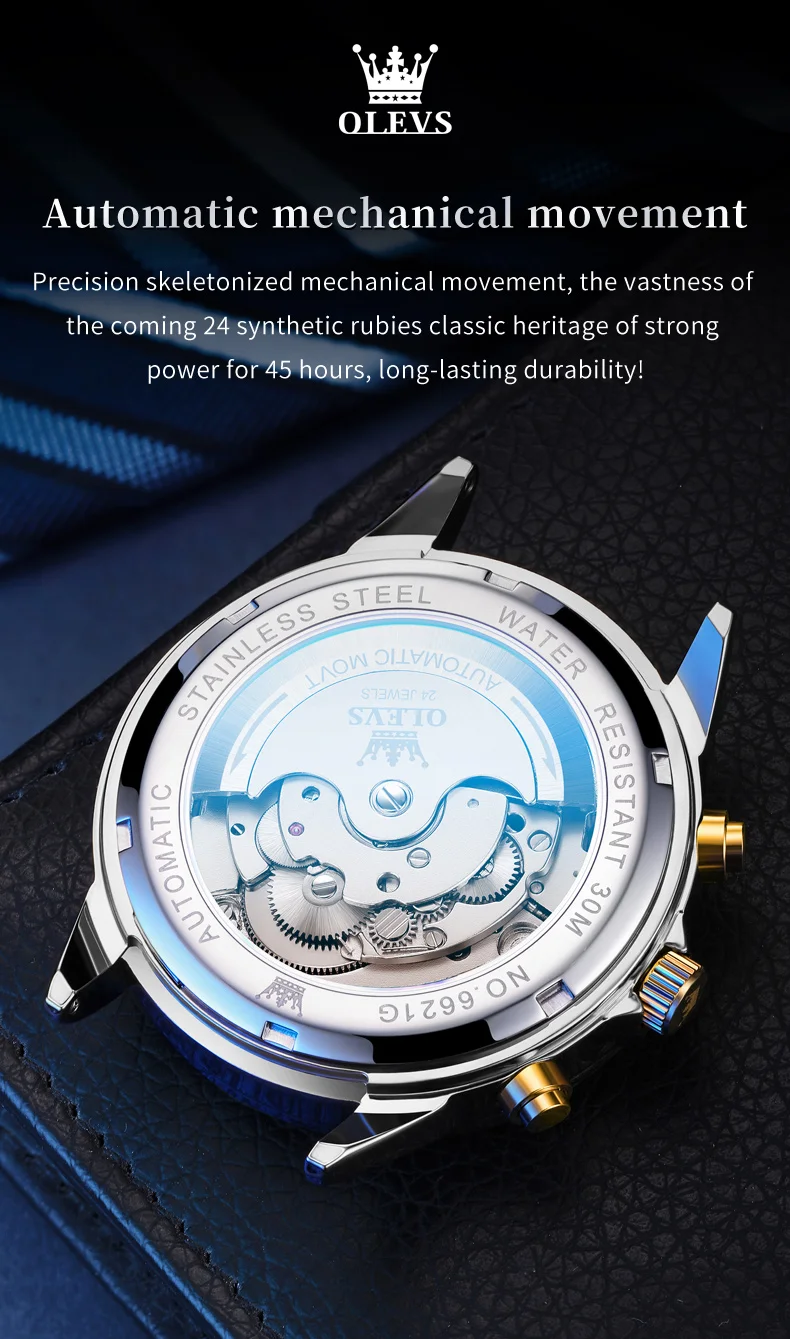 The Olevs 6621 Automatic Men Watch is a bold and refined timepiece designed for men who appreciate mechanical precision and enduring style. Powered by automatic movement, it eliminates the need for batteries, offering smooth performance and long‑lasting reliability. With its robust stainless‑steel case, elegant dial, and comfortable strap, the 6621 is perfect for both professional wear and casual occasions, making it a versatile choice for modern gentlemen.